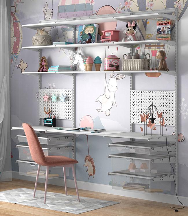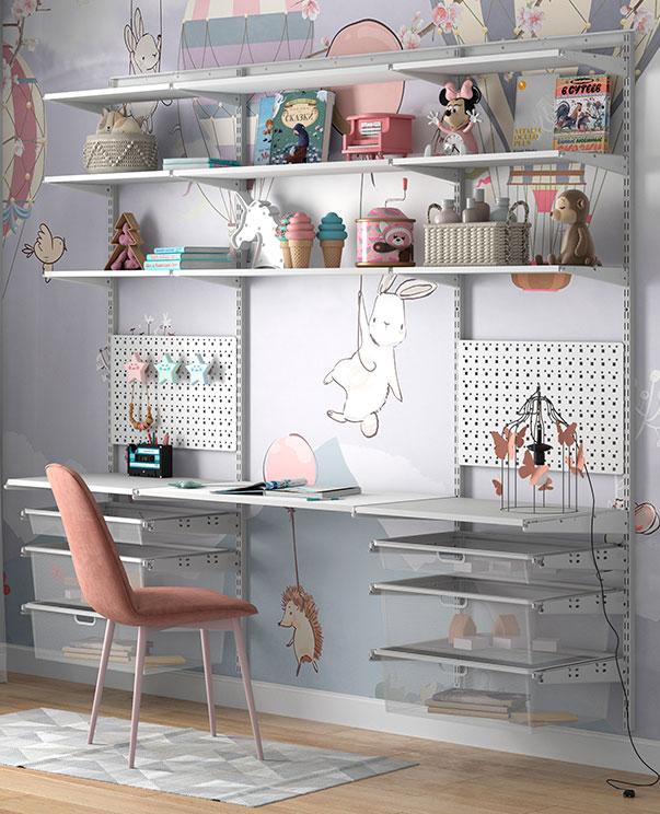 Гардеробная система ПРАКТИК HOME растёт вместе с ребёнком — полки, корзины и рабочие поверхности можно менять местами, адаптируя под возраст и потребности.